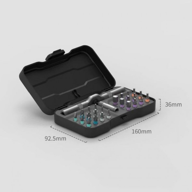 Внутри картонной упаковки расположен пластиковый бокс с логотипом в центральной части. Размеры бокса — 16 х 9,25 х 3,6см, вес — 330гр. Внутри на пластиковой подложке находится трещотка с удлинителем, а так же весь набор оснастки. Ручка отвертки разборная, что позволяет быстро переключатся между различными случаями.